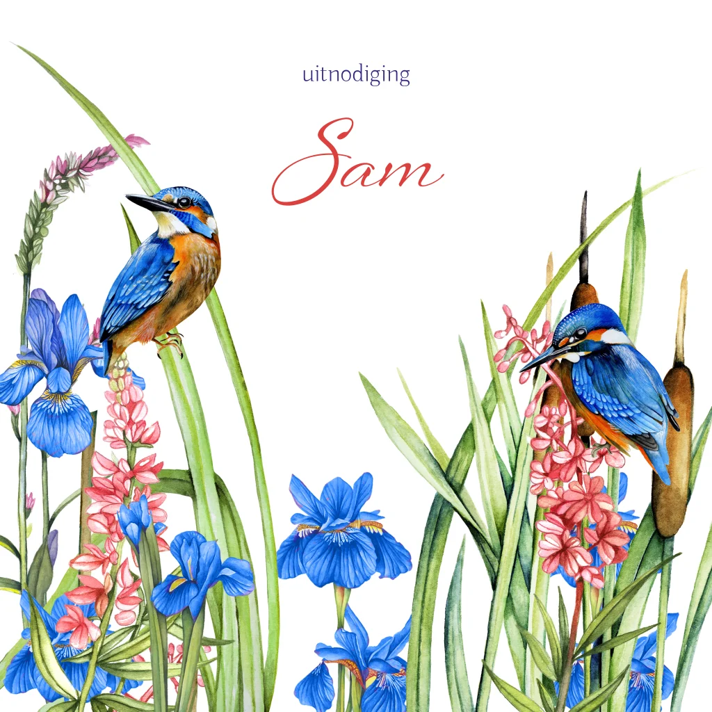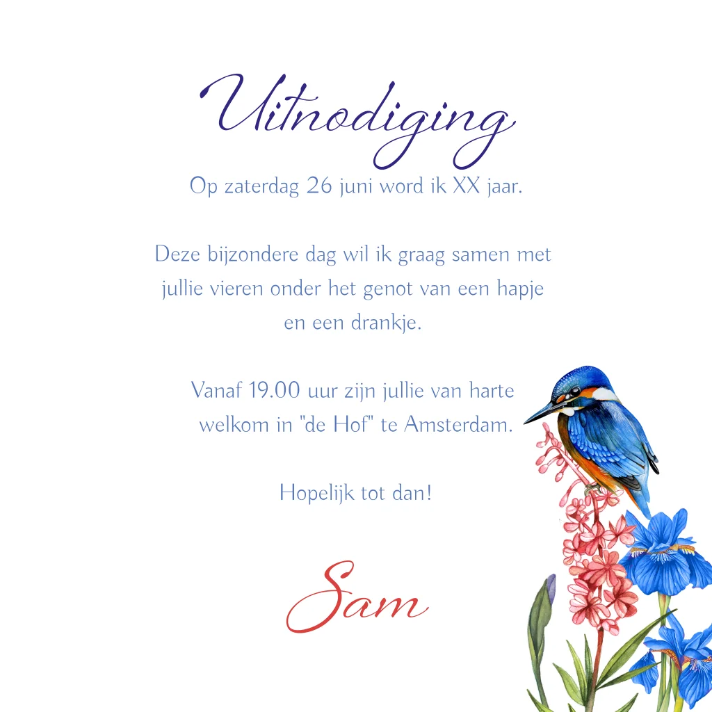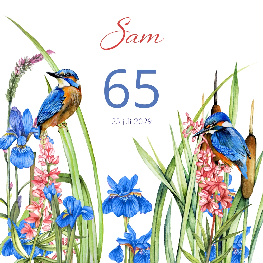 Uitnodiging verjaardag 65 jaar met ijsvogel en blauwe en rode bloemen