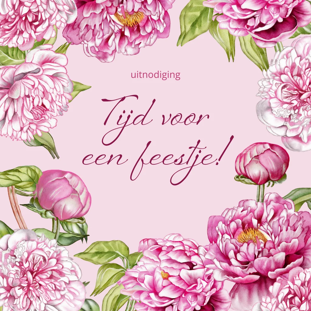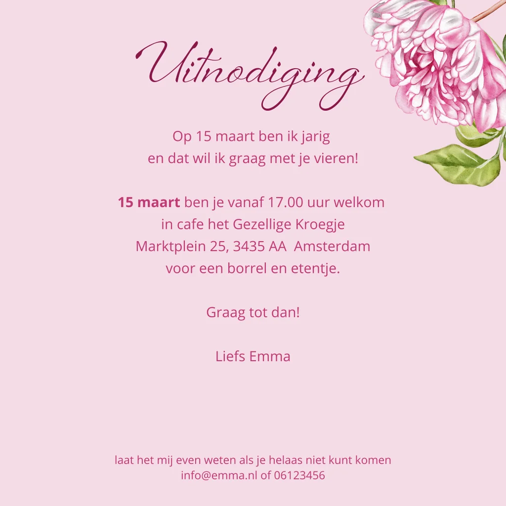 Uitnodiging feestje verjaardag vrouw met roze pioenroos