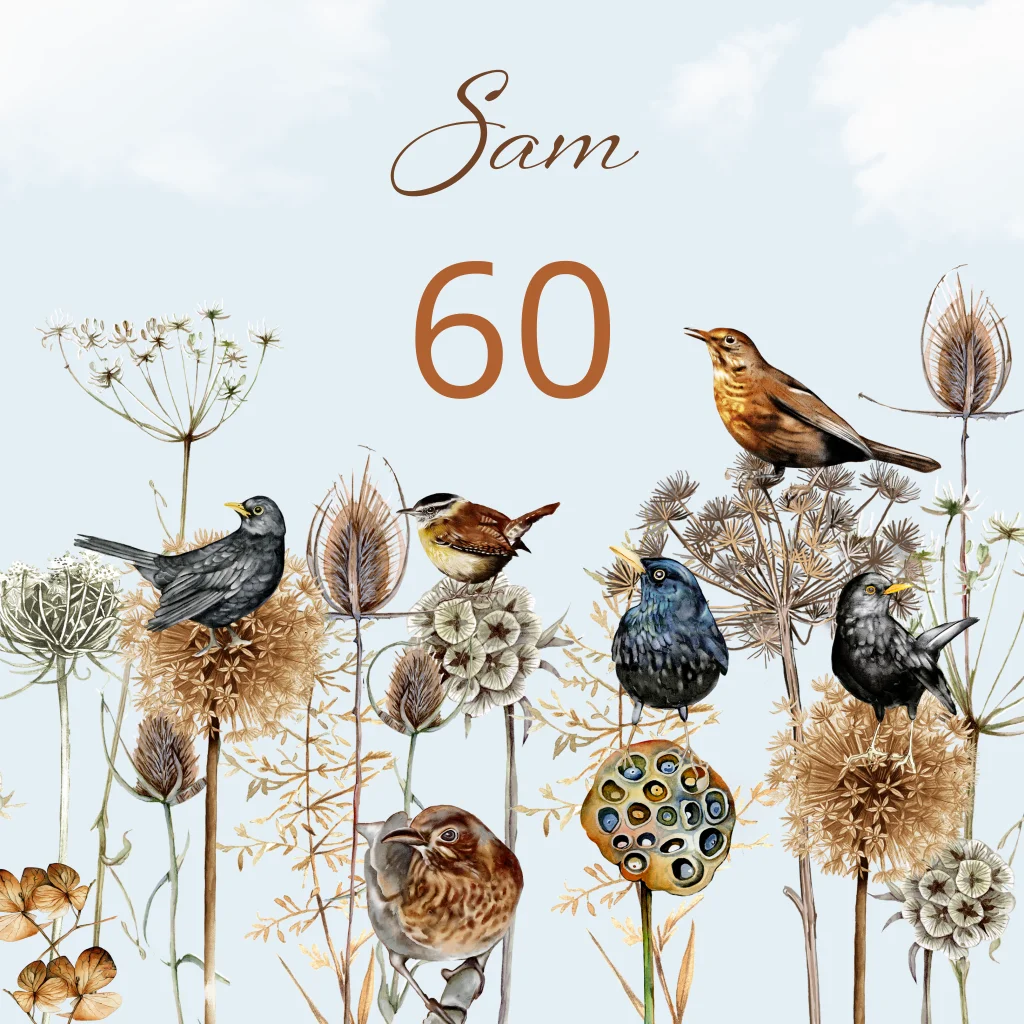 Uitnodiging 60 jaar verjaardag man 60 jaar met leuke tuinvogels als mus en merel op mooie takken. (24549)