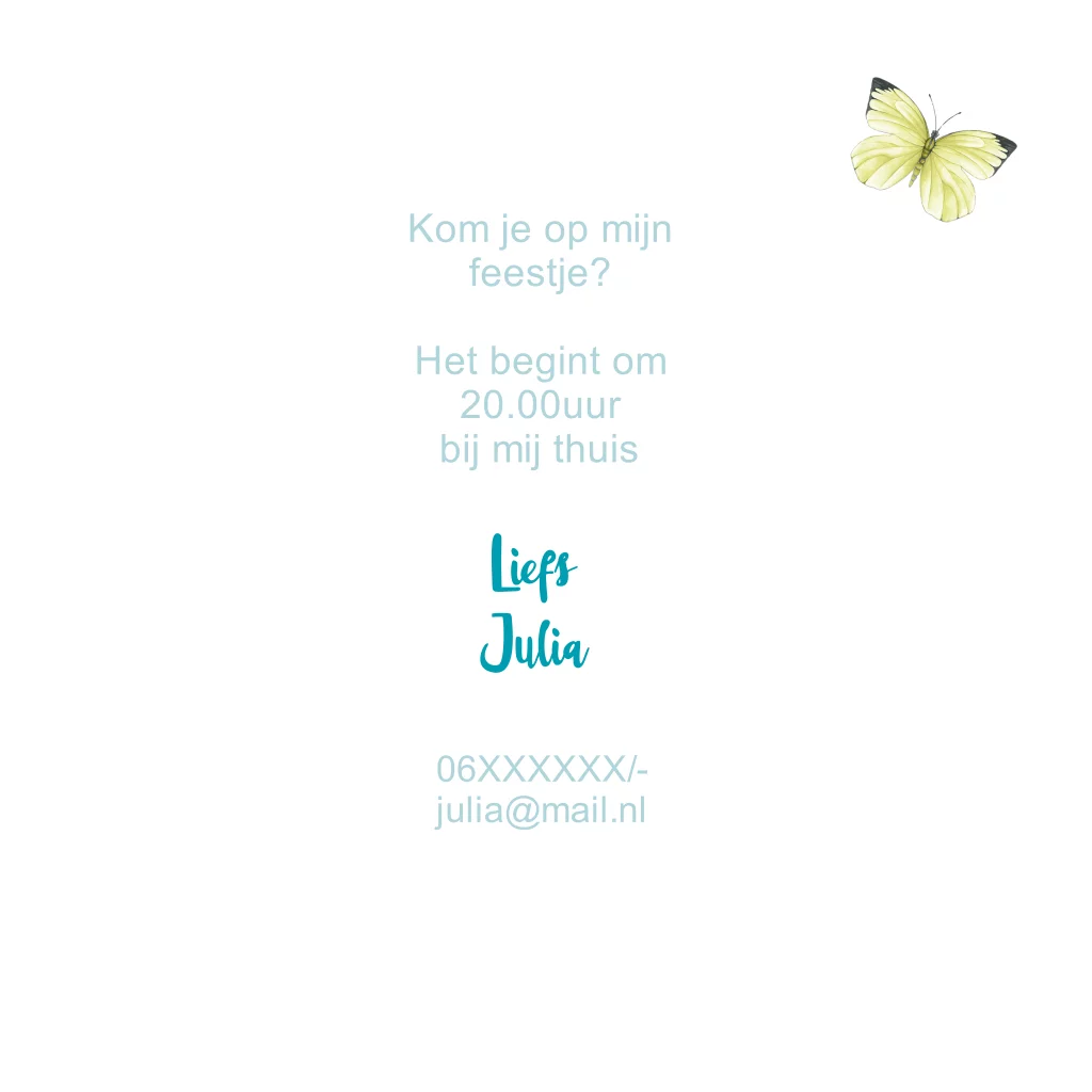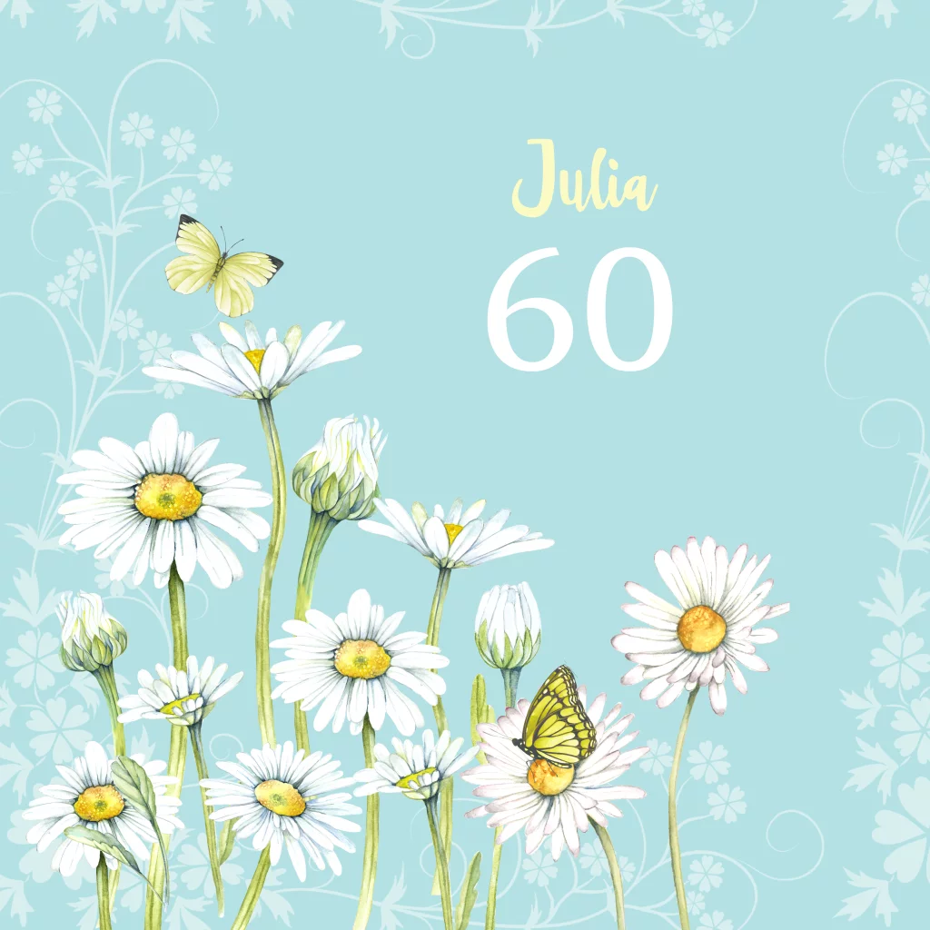 Uitnodiging voor een verjaardagsfeestje 50 jaar vrouw met bloemen voorjaars margrietjes en vlinders. (8309)