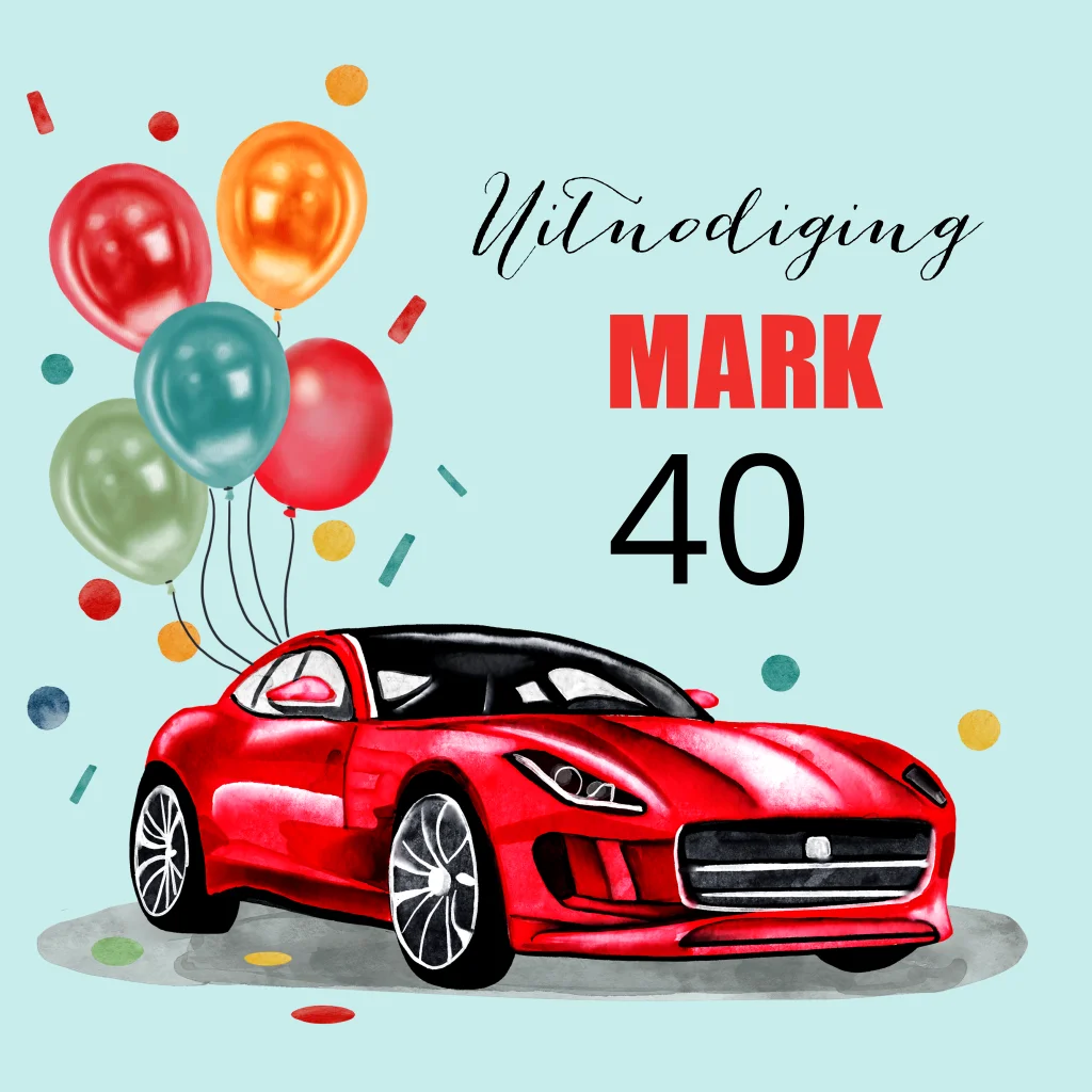 Uitnodiging 40 jaar voor een feestje voor een man met rode sportauto en ballonnen (24713)