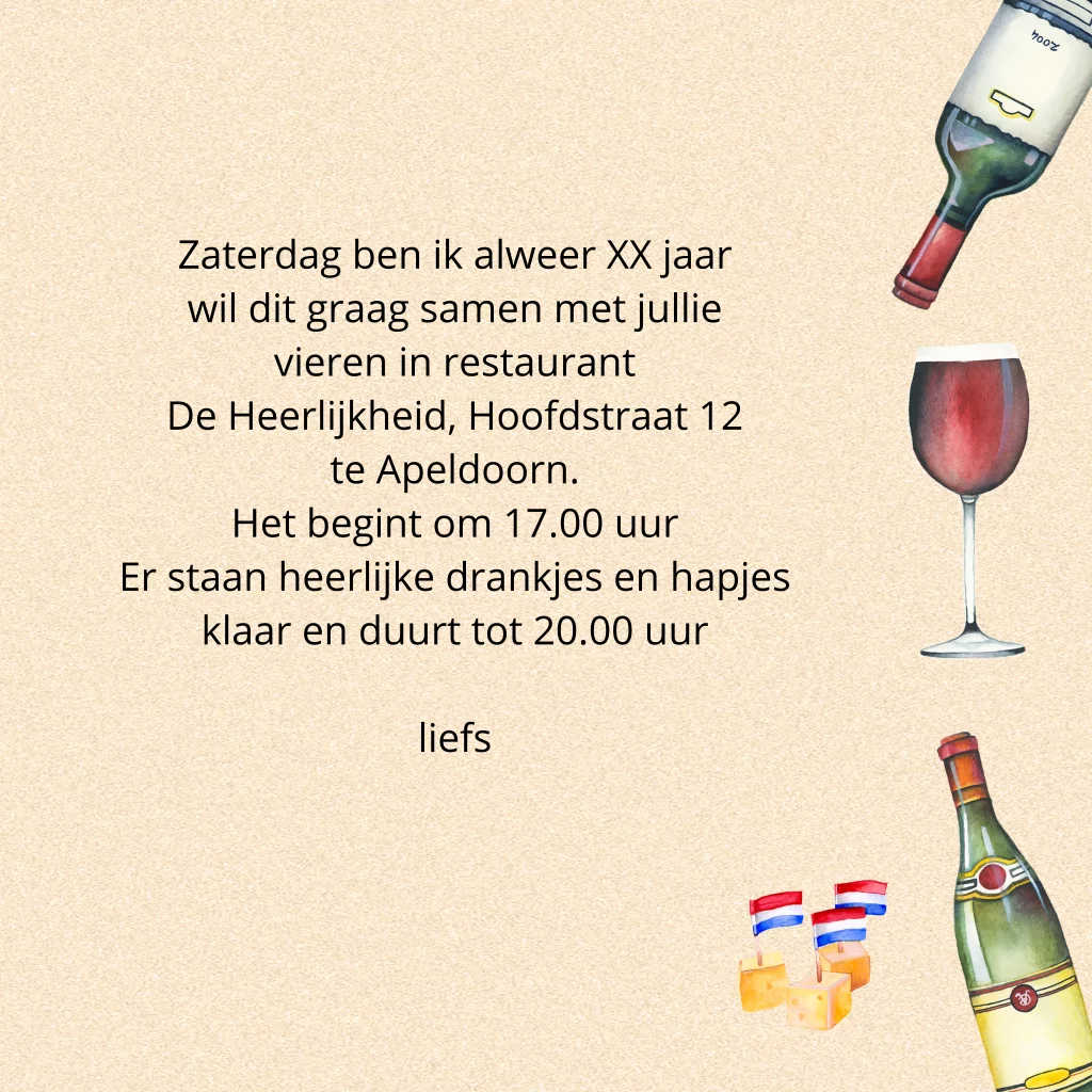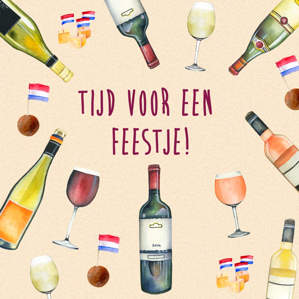 Uitnodiging voor een gezellig hollands thema feestje of borrel met wijn en hapjes als bitterballen en blokjes kaas (23730)