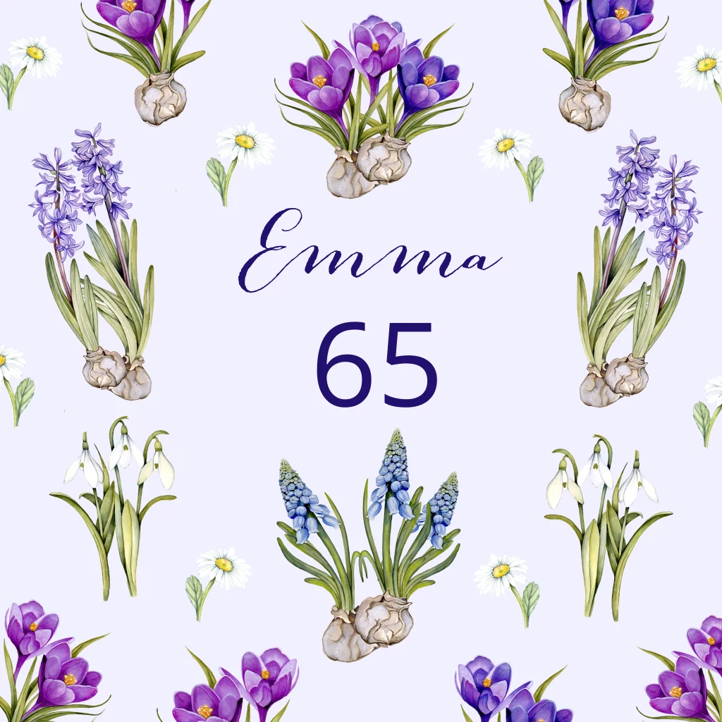Uitnodiging 65 jaar met leuke voorjaarsbollen zoals hyacint, crocus, sneeuwklokje en blauwe druifje. (23548)