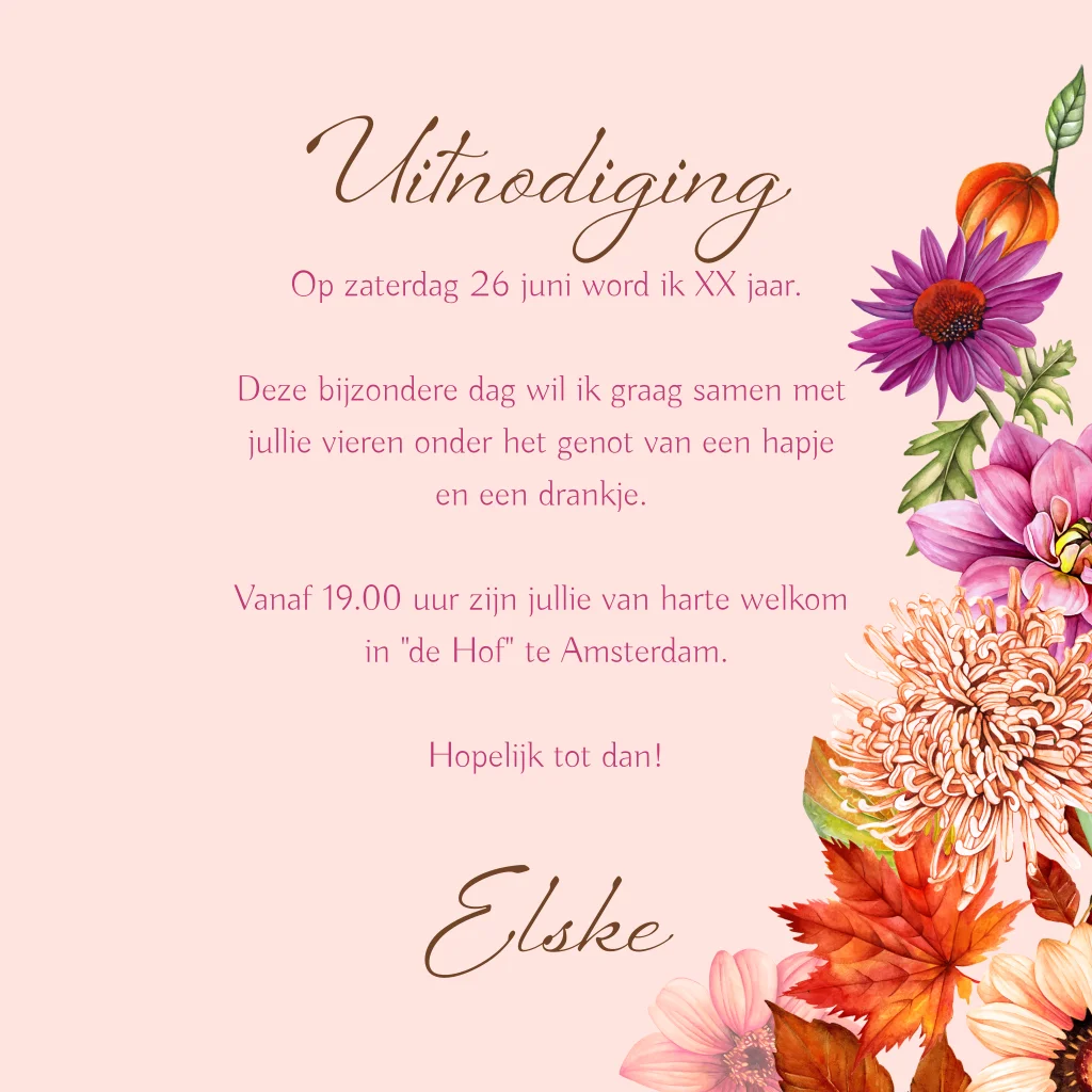 Uitnodiging verjaardag vrouw met kleurrijke herfst bloemen