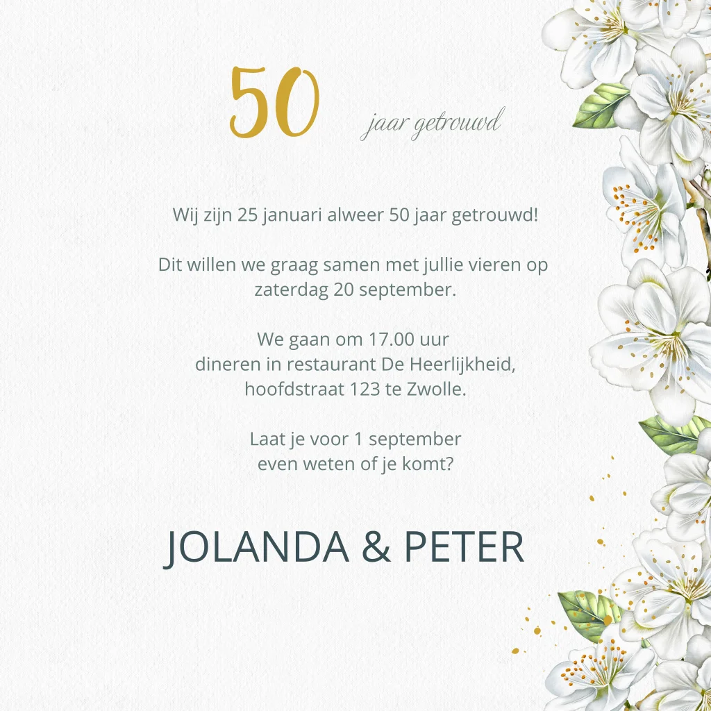 Uitnodigingskaart 50 jaar getrouwd witte bloesemtakken met goudfolie