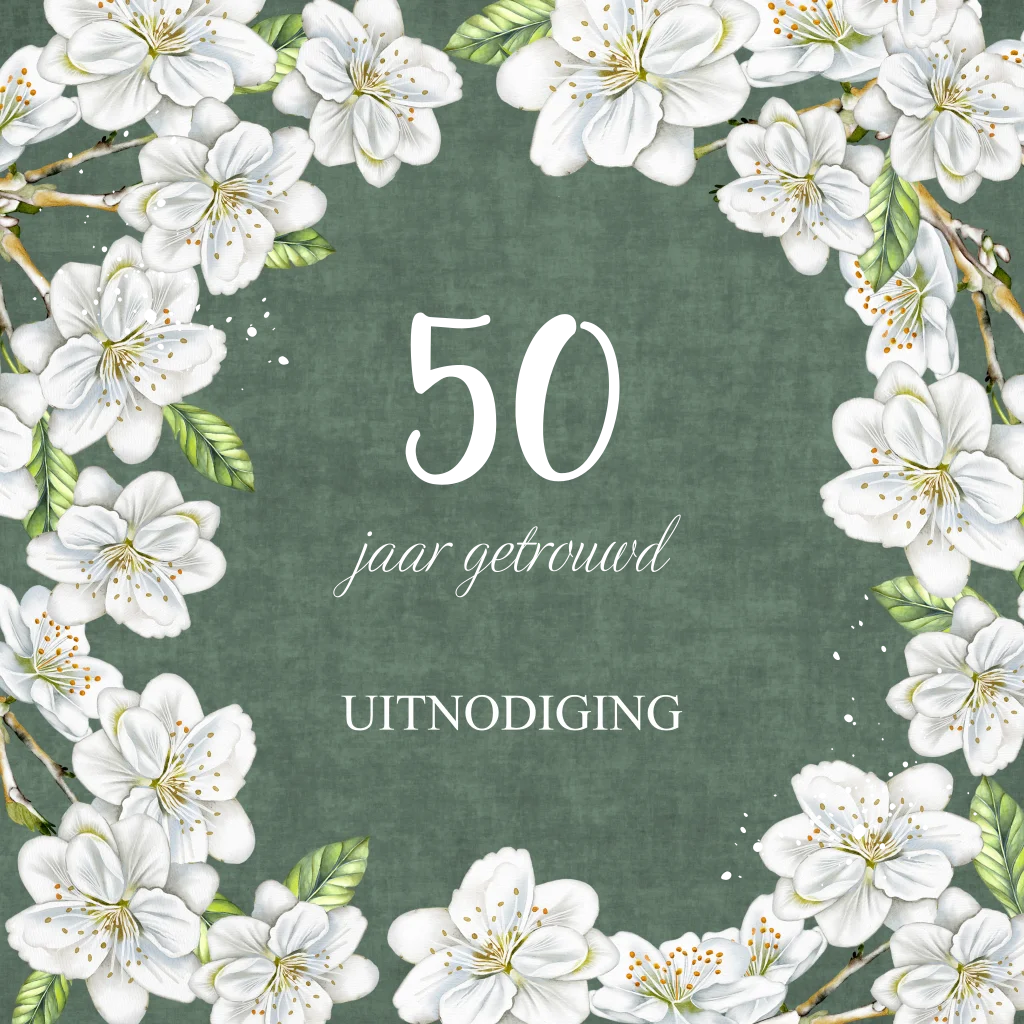 Uitnodiging 50 jaar getrouwd kaart groen met mooie bloesemtakken in het wit op groen fluweel en echte goudfolie 50 en jaar getrouwd. (30337)