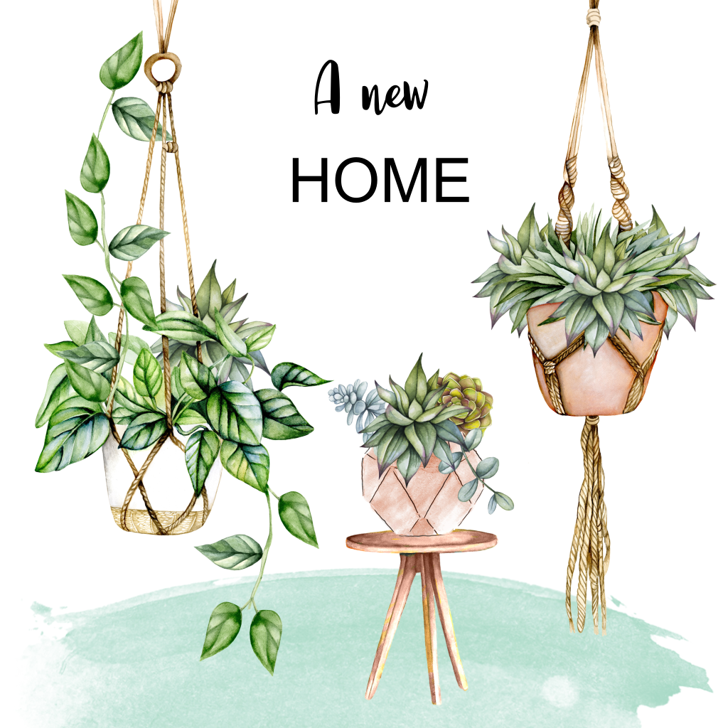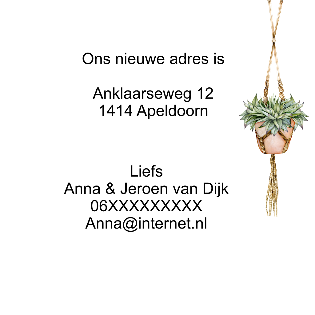 Hippe verhuiskaart met hangplanten in macramé hangers. (22156)