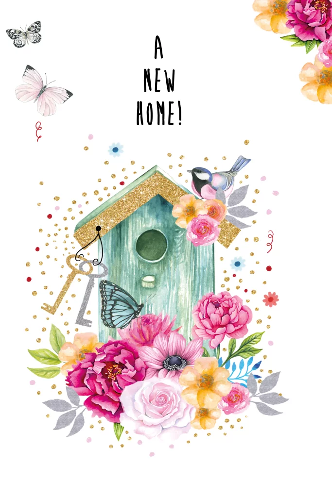 Verhuiskaartje met leuk vogelhuisje versierd met bloemen en goudkleurige glitter. (8086)