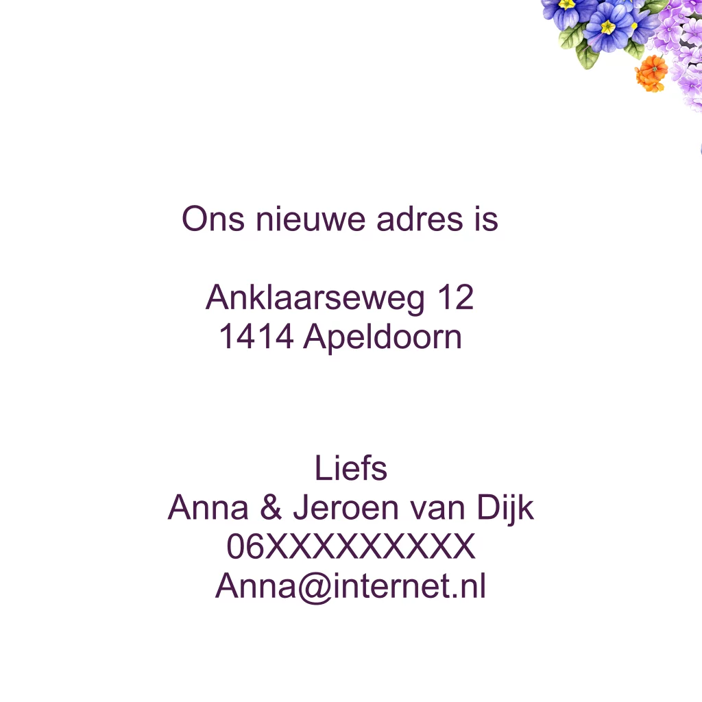 Verhuiskaart met vogeltjes, bloemen en vogelhuisje
