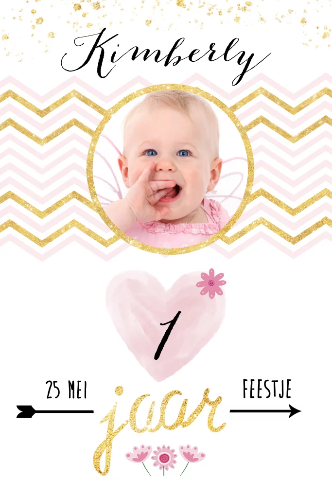 Uitnodiging 1ste verjaardag voor een meisje met chevronpatroon en hartje van aquarel in roze en glitter goud-look versierd met bloemetjes. (5085)