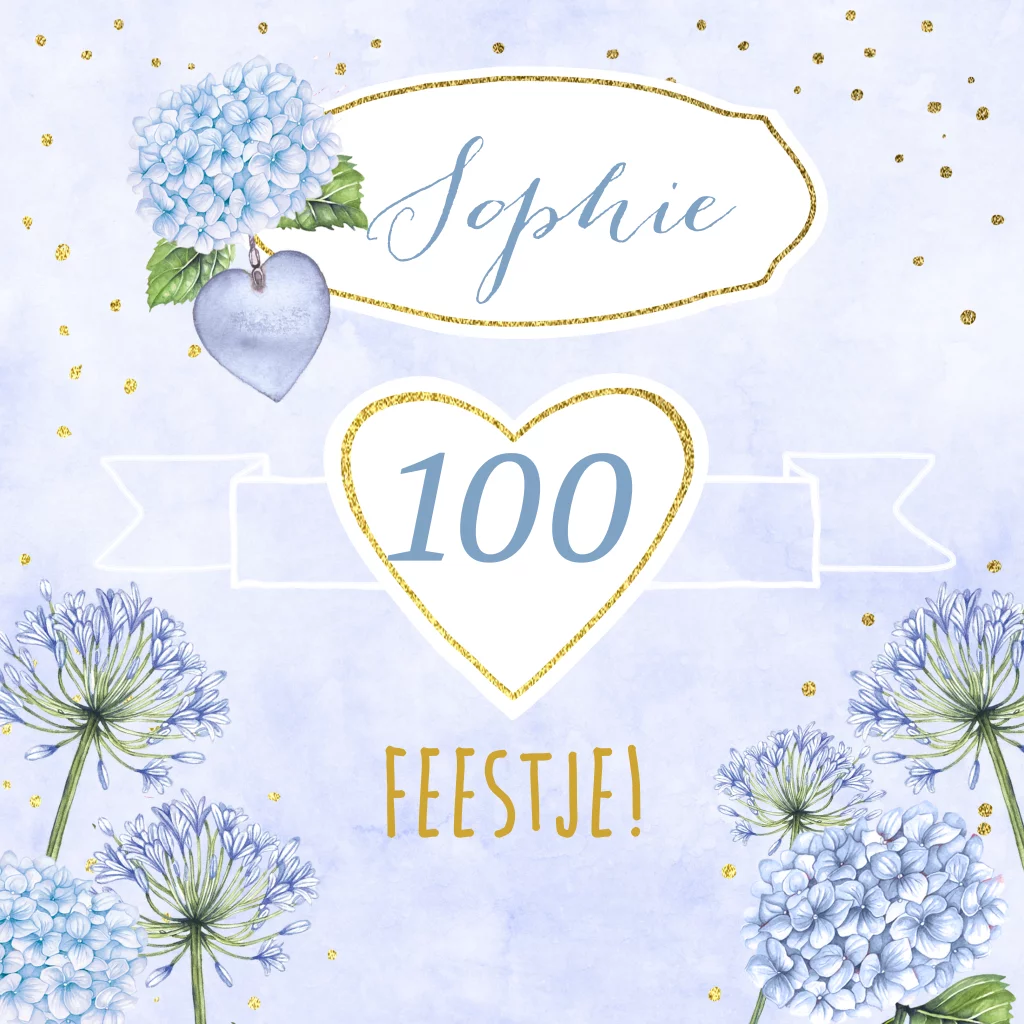 Uitnodiging voor een 100e verjaardag of gestopt met werken met blauwe hortensia en afrikaanse lelies met hart versierd met glitter en label. (5904)