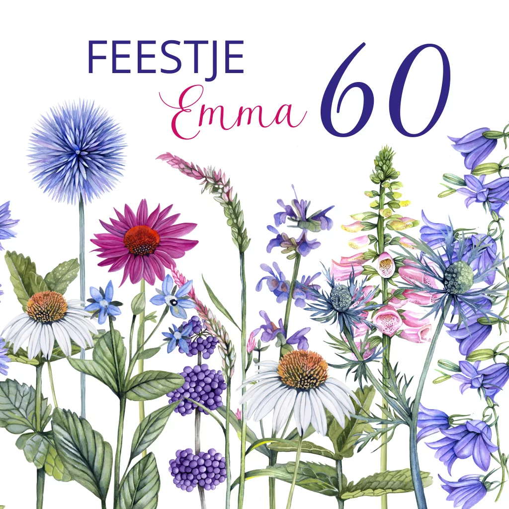 60 jaar Uitnodiging voor een verjaardagsfeestje met mooie wilde bloemen gemaakt in aquarel. (23996)