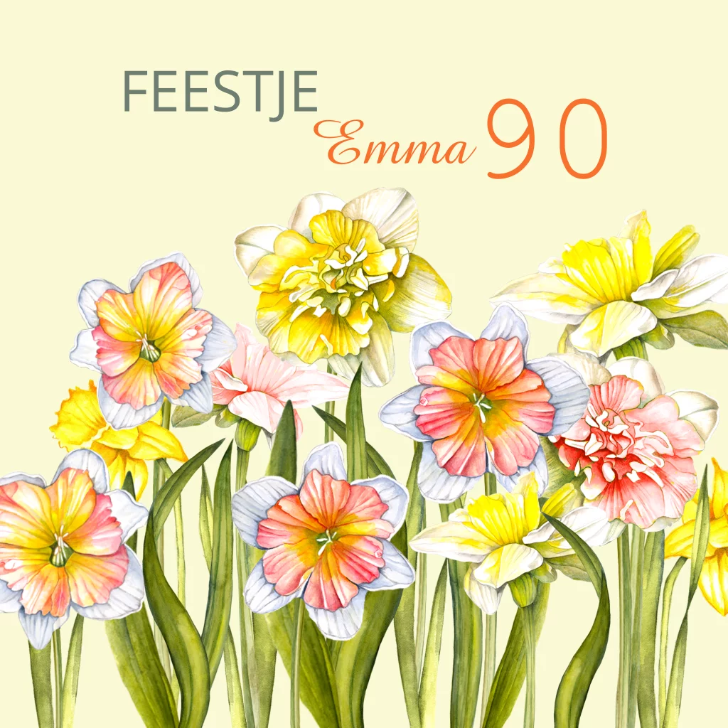 Verjaardagsuitnodiging 90 jaar voor een vrouw met narcissen