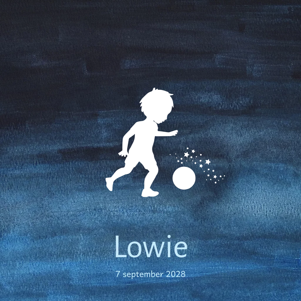 Stoer geboortekaartje voor een jongen met blauwe achtergrond en silhouet van een voetballer. (23990)