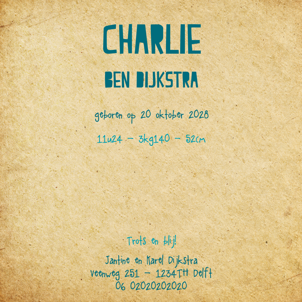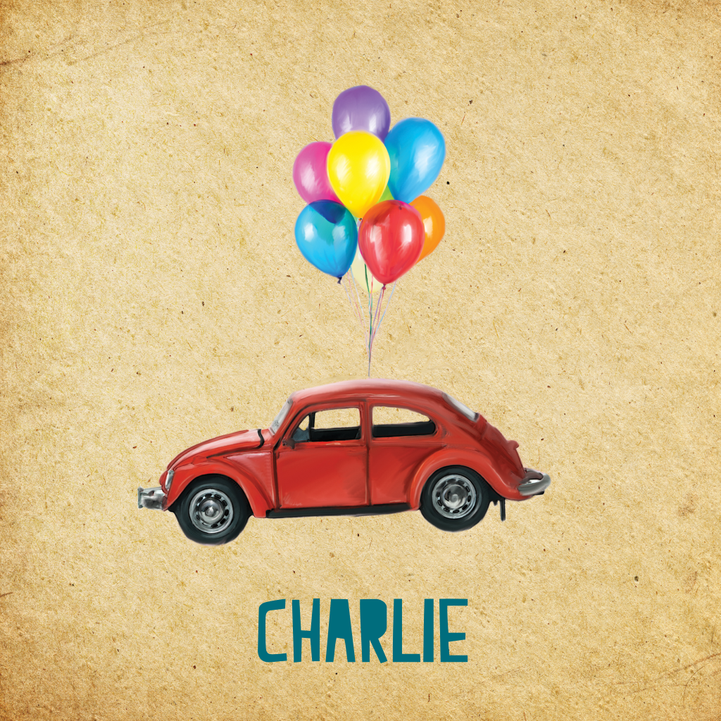 Getekende geboortekaartje op kraftpapier met een VW kever beetle en ballonnen. Illustratie geschilderd. (5009)