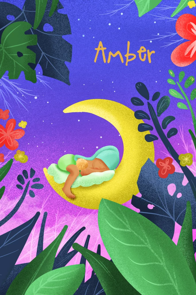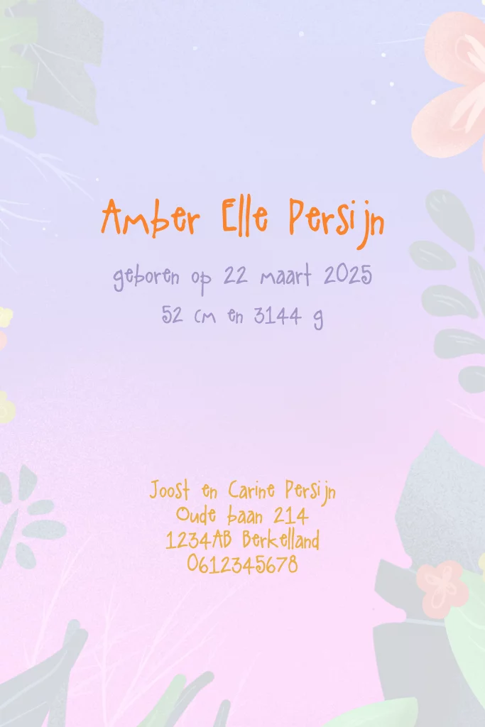Dit geboortekaartje heeft een mooi en schattig thema: een slapend meisje op de maan, omgeven door planten en bloemen kleurrijk. (23436)