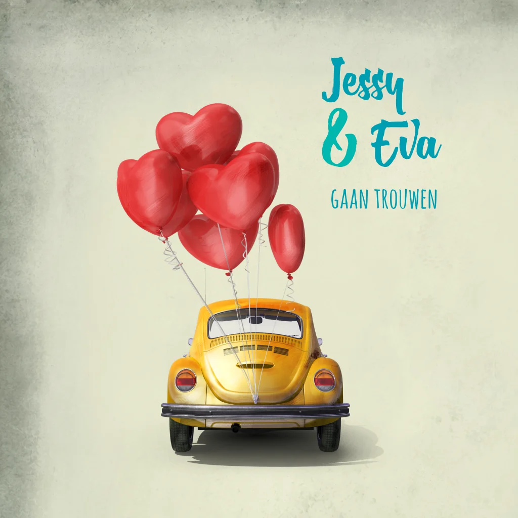 Deze leuke trouwkaart is voorzien van een gele beetle kever volkswagen met rode ballonnen in de vorm van een hart. (9835)