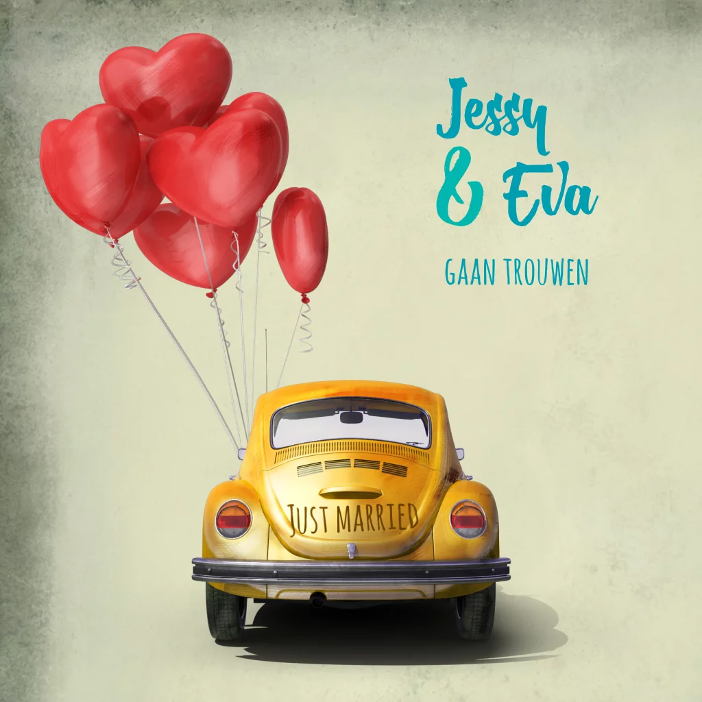 Deze leuke trouwkaart is voorzien van een beetle volkswagen met ballonnen in de vorm van een hart. (9835)