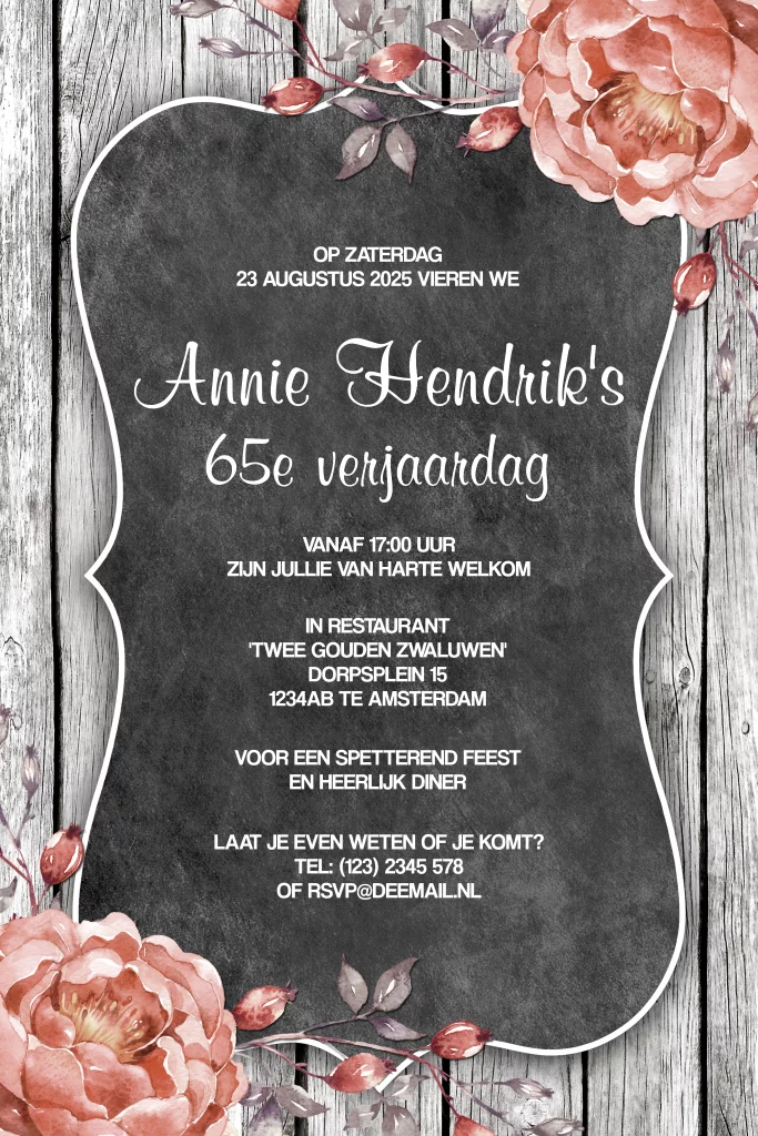 Vintage uitnodiging 65 jaar met bloemen en krijtbord