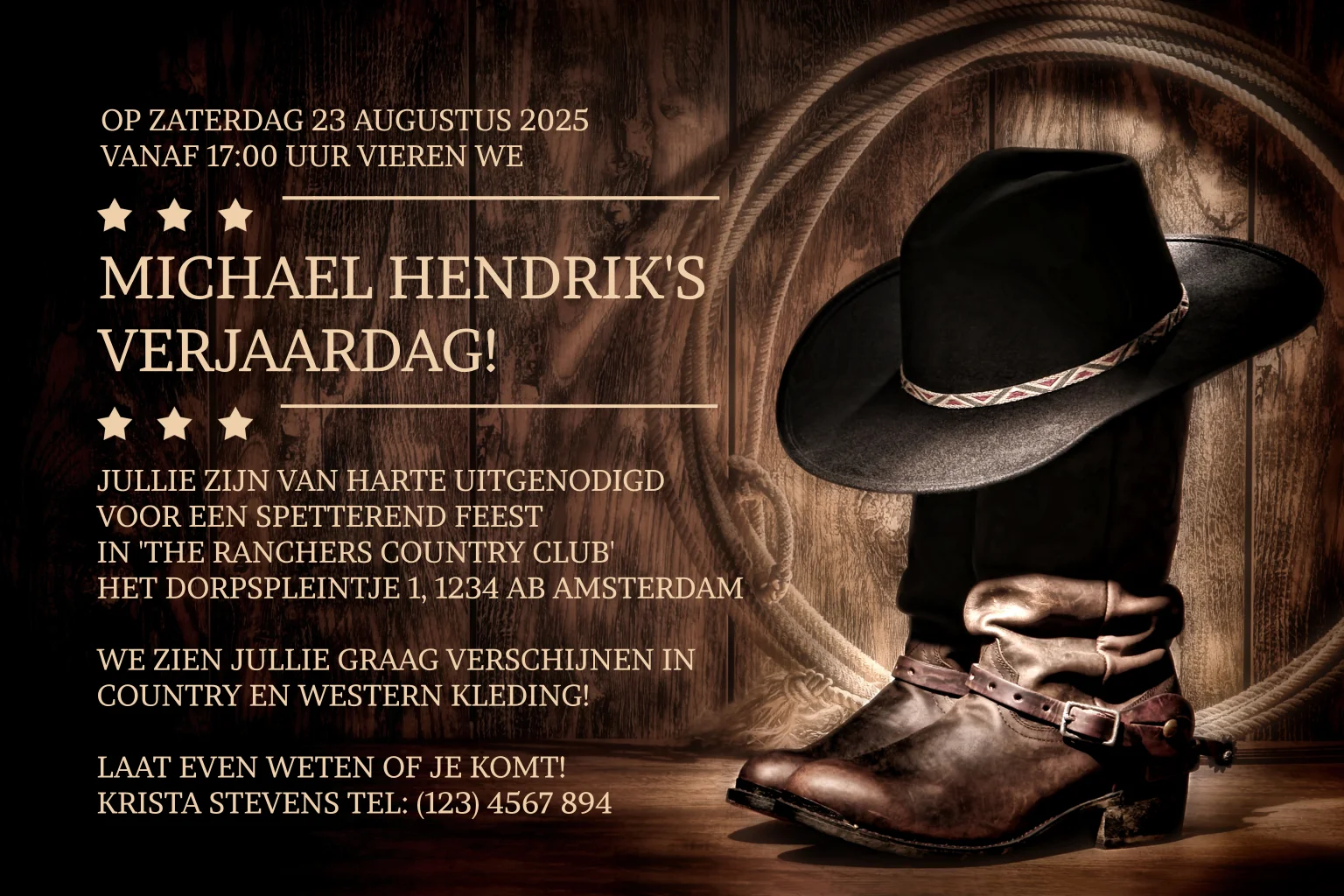 Stoere verjaardagsuitnodiging in country en western stijl voor een verjaardag. (5549) met cowboylaarzen en een stoer hoed.