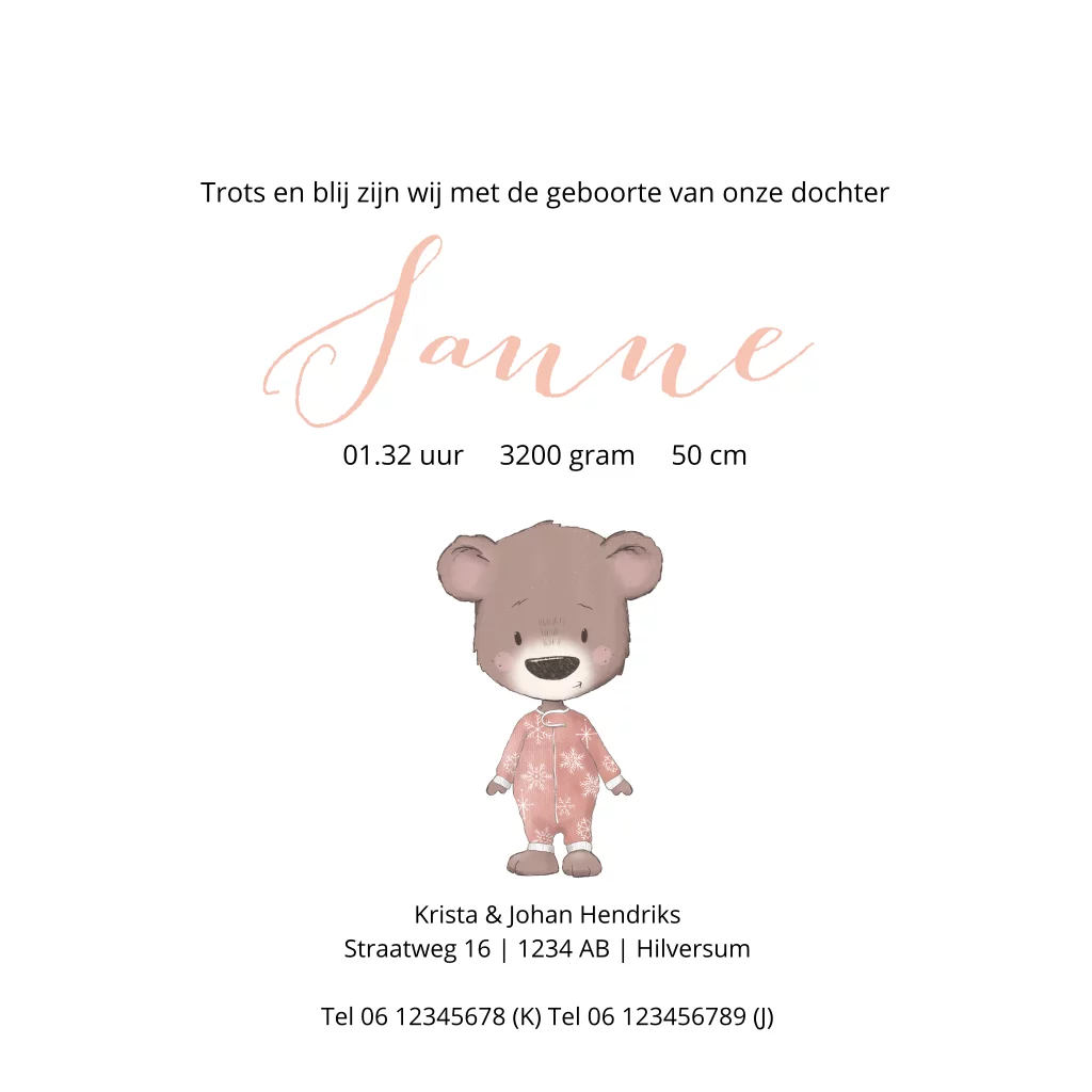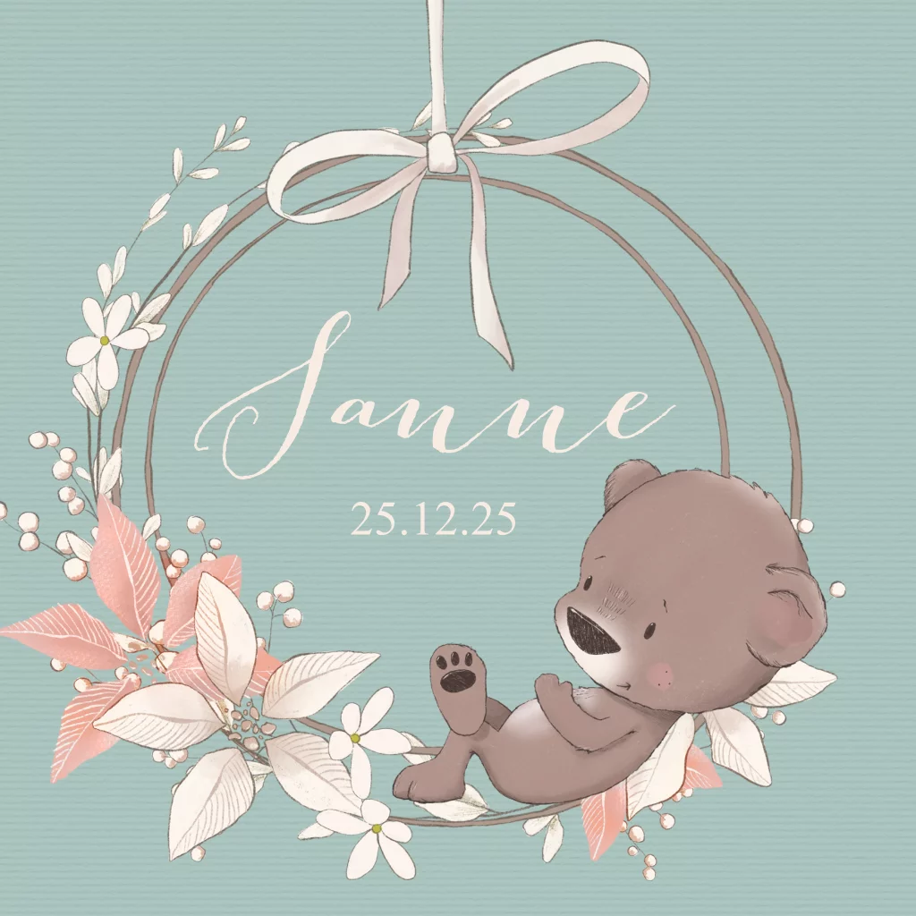 Geboortekaartje beertje meisje met roze bloemen. met bloemenkrans op groene achtergrond. Aan de binnenkant staat een foto, maar dit kan ook zonder foto.