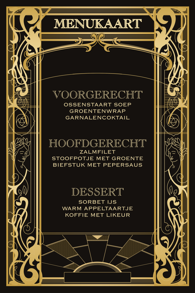 Deze Great Gatsby menu kaart in Art Deco stijl is perfect voor een bruiloft met roaring twenties thema. (5520)