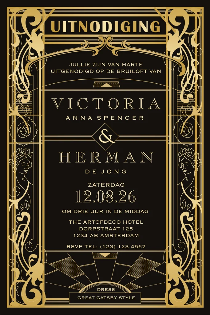 Deze Great Gatsby trouwkaart huwelijksuitnodiging in Art Deco stijl is perfect voor een bruiloft met roaring twenties thema. (5520) trouwkaarten Wil je deze kaart maar dan dubbel zodat je meer ruimte hebt? Dat kan! Neem daarvoor contact met ons op.