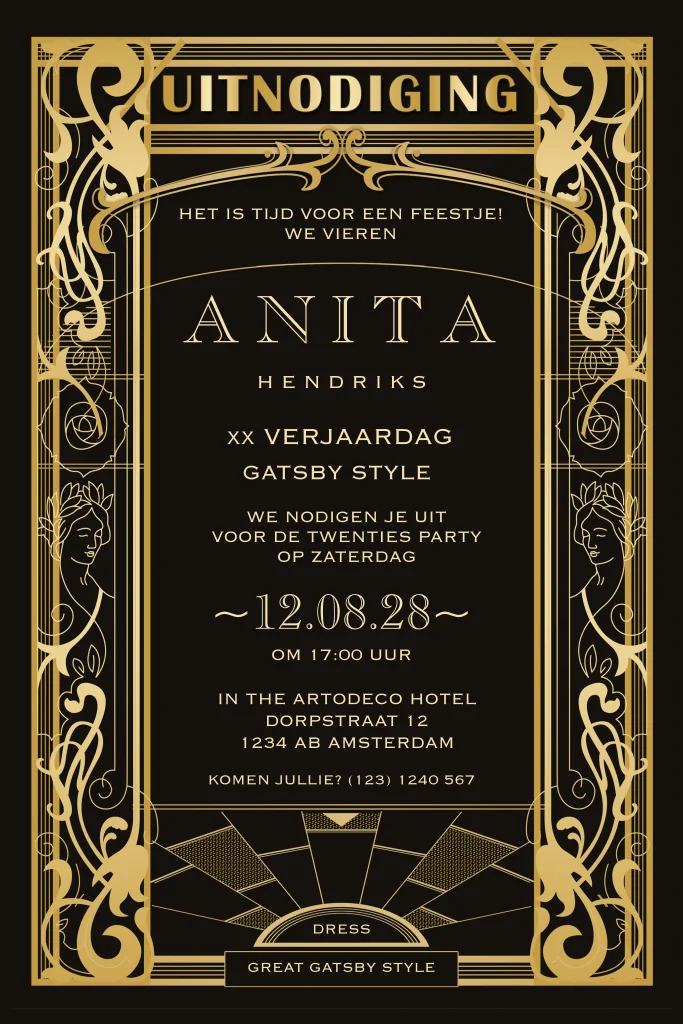 Great Gatsby verjaardagsuitnodiging Art Deco stijl