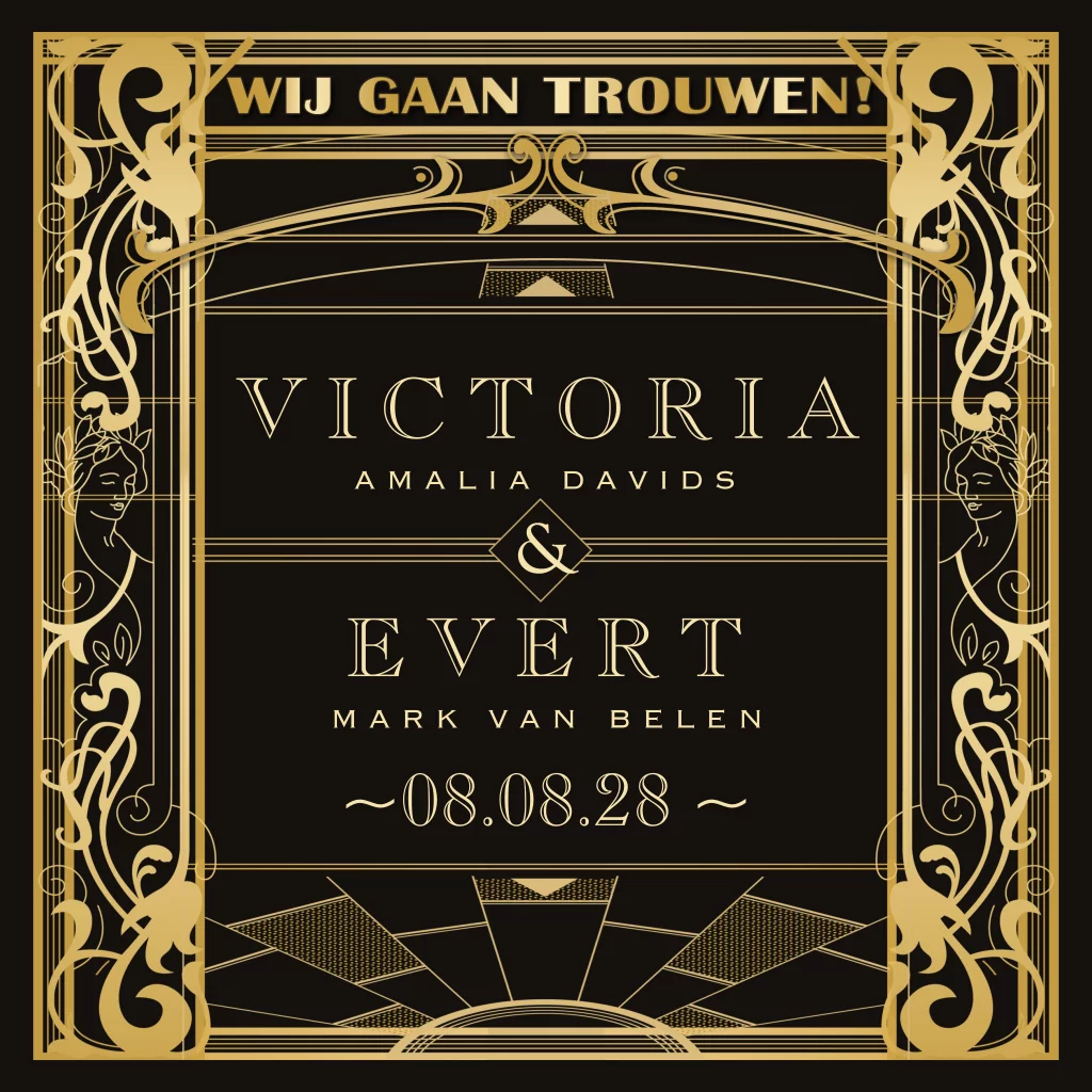 Deze Great Gatsby Trouwkaart in Art Deco stijl is perfect voor een huwelijk met vintage roaring twenties thema. (6534)