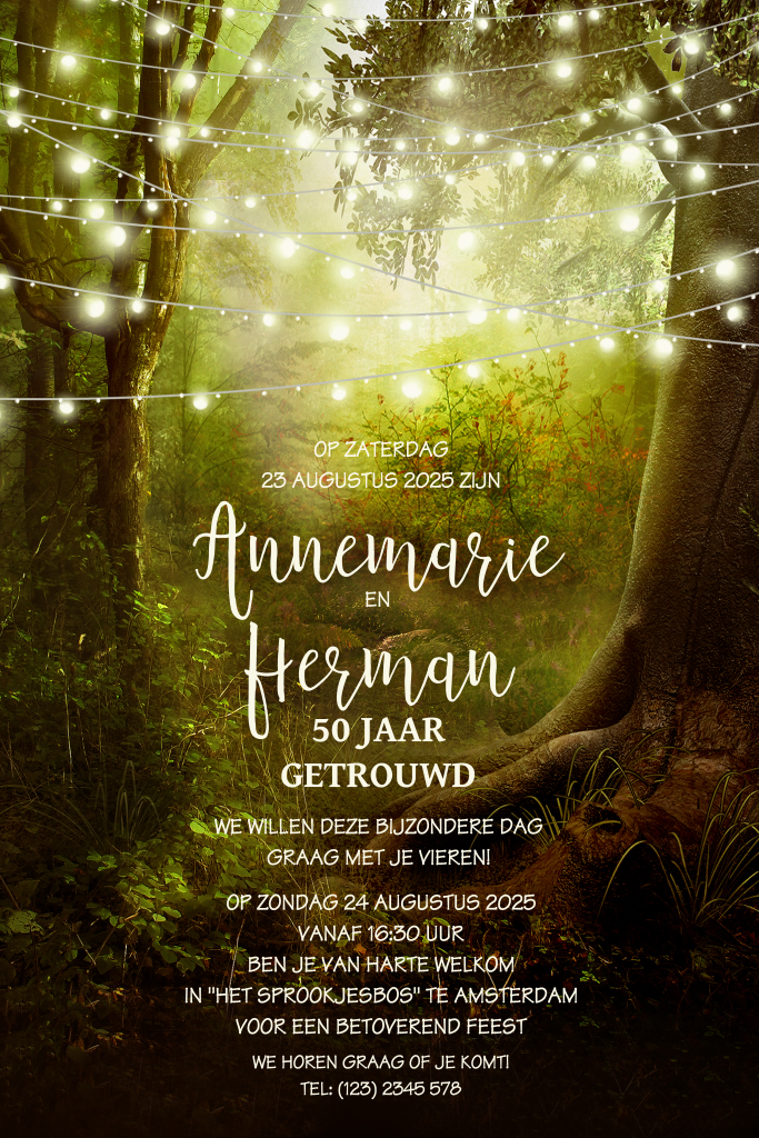Jubileum uitnodiging sprookjesbos met lichtslingers