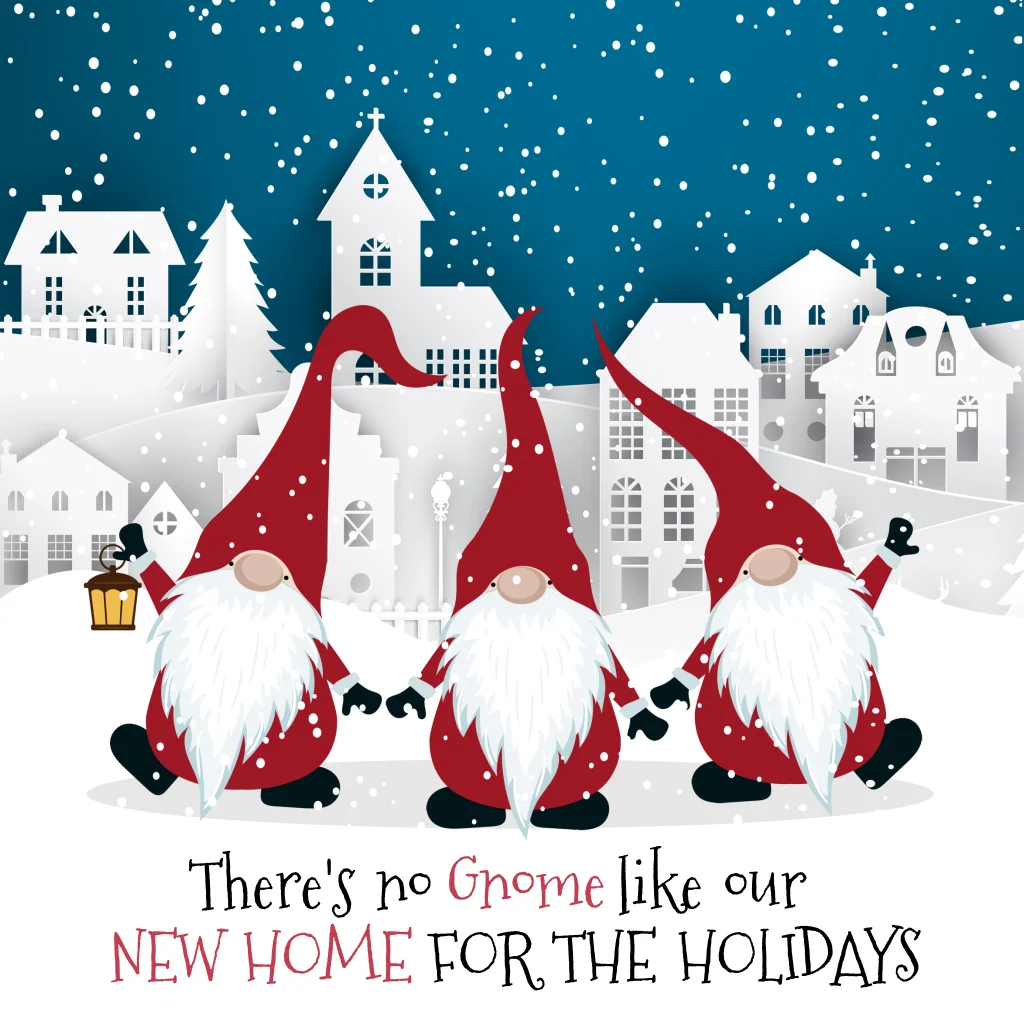 Kerst verhuiskaart met kerstmannetjes kerst-gnoom kabouter voor huisje in de sneeuw. (20525)