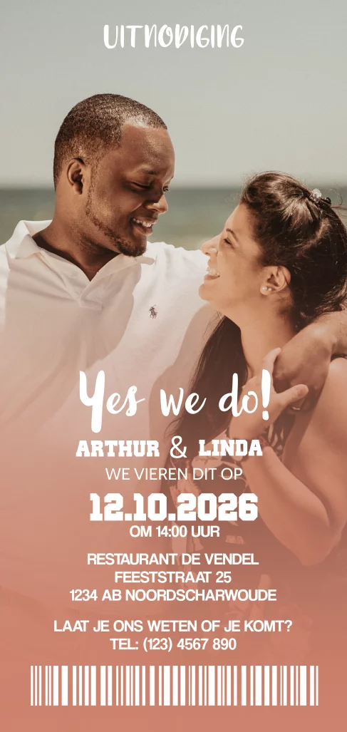 Mooi trouwkaart in ticket vorm met voldoende ruimte voor een eigen foto. (8701)