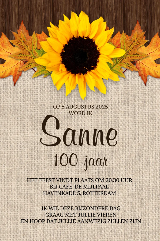 Herfst achtige uitnodiging 100 jaar met herfstbladeren en een zonnebloem op jute en donkerbruin hout. (6013)