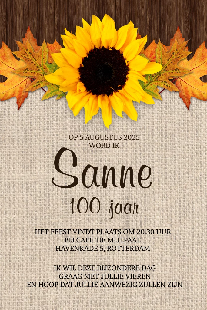 Rustieke herfst verjaardagsuitnodiging 100 jaar met herfstbladeren en een zonnebloem op jute en donkerbruin hout. (6013)