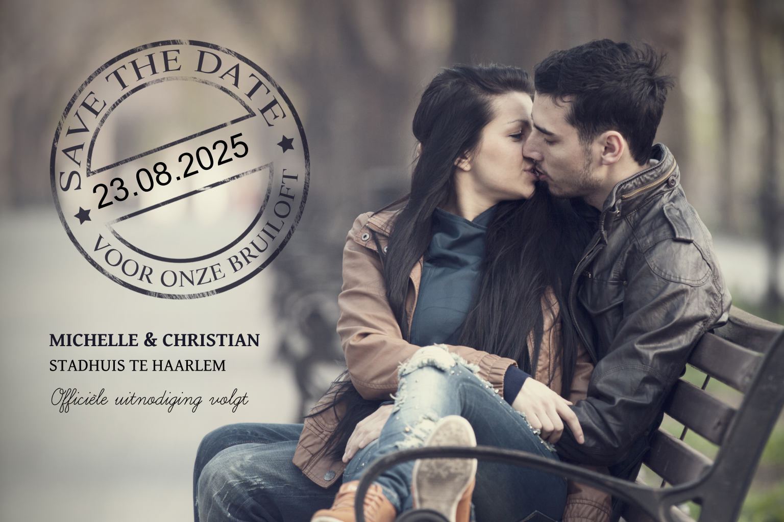 Dubbelzijdige save the date kaart met eigen foto en stempel