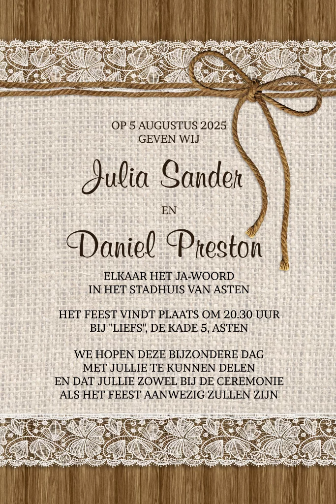 Deze rustieke trouwkaart dankt haar stijlvolle uiterlijk door het gebruik van jute, kant en een sierlijk strikje op een mooie bruin houten achtergrond. Perfect voor een luxe bruiloft met een vleugje nostalgie. (5486)