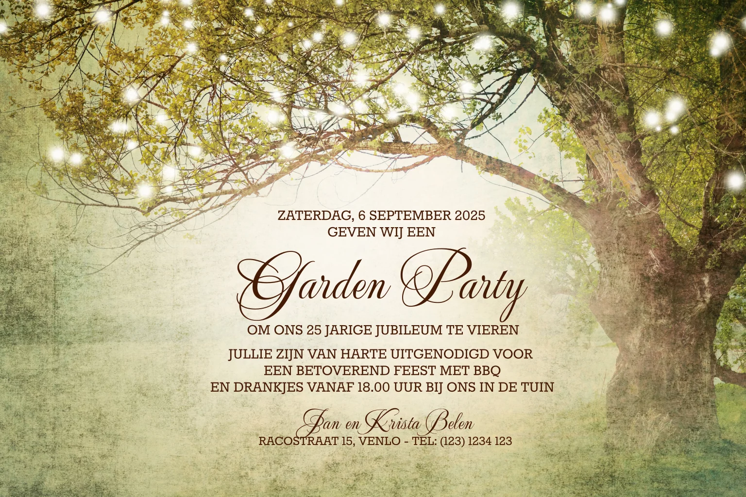 Deze tuinfeest uitnodiging is perfect voor een betoverende garden party met BBQ in jullie feestelijk verlichte tuin. (5490)