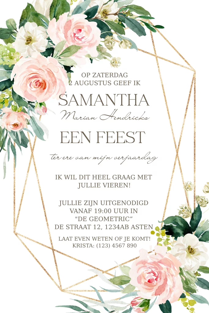 Uitnodiging voor een verjaardag roze bloemen en goud