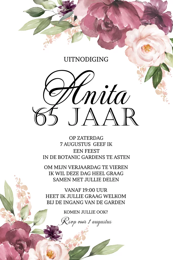 Uitnodiging voor 65e verjaardag vrouw met roze en paarse bloemen