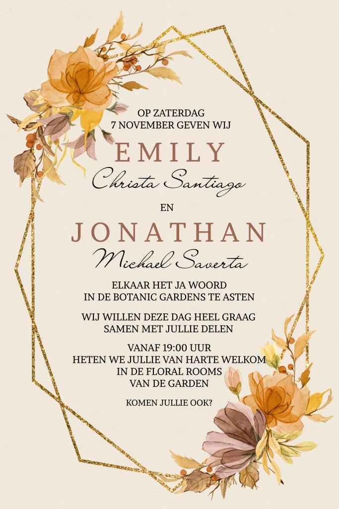 Uitnodiging voor herfst huwelijk goudkleurige geometrische vormen. (8513)