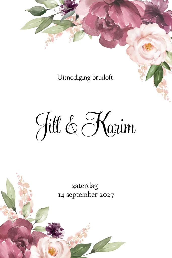 Uitnodiging bruiloft trouwen voor huwelijk met prachtige roze en paarse bloemen. (8459)