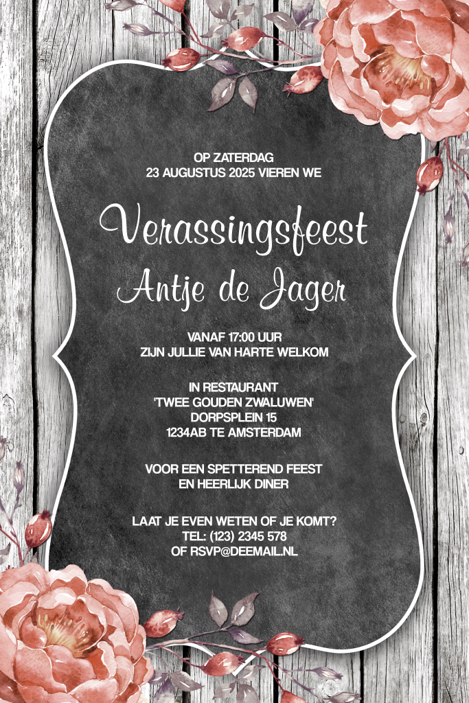 Vintage verjaardagsuitnodiging verassingsfeest met bloemen, krijtbord en stijgerhout. (5853)