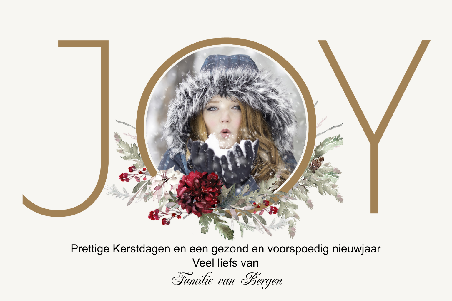 Winterse kerstkaart met foto in de tekst JOY
