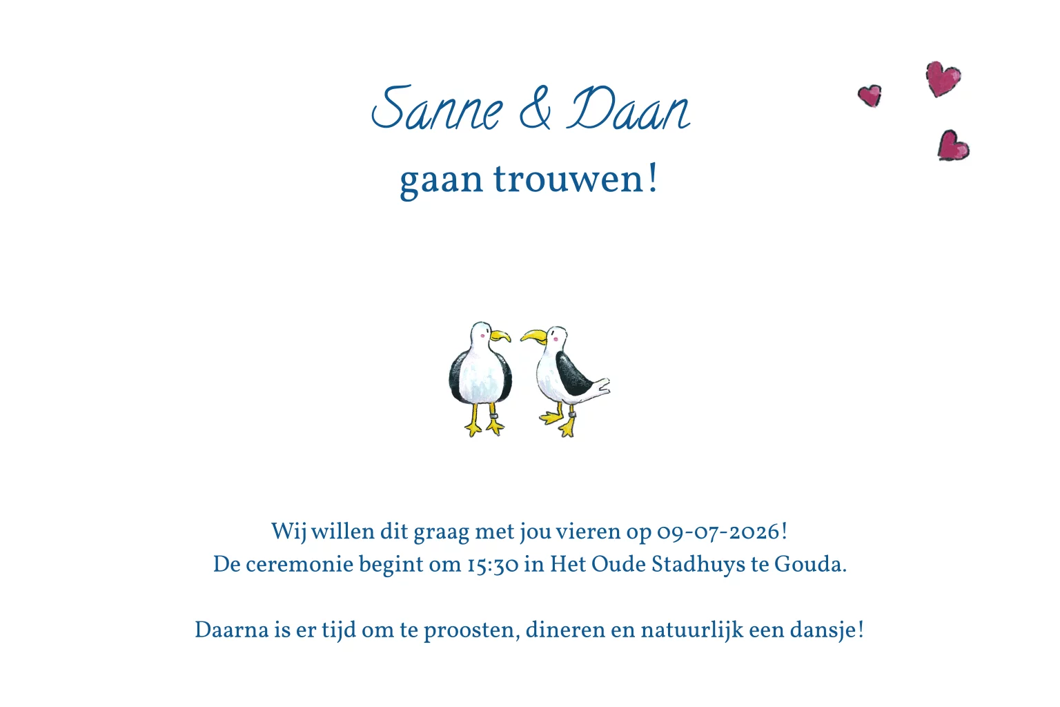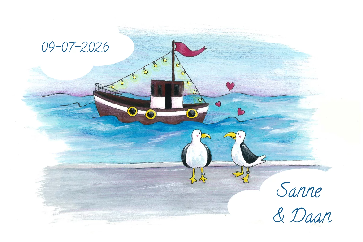 Vrolijk getekende trouwkaart met boot en meeuwen