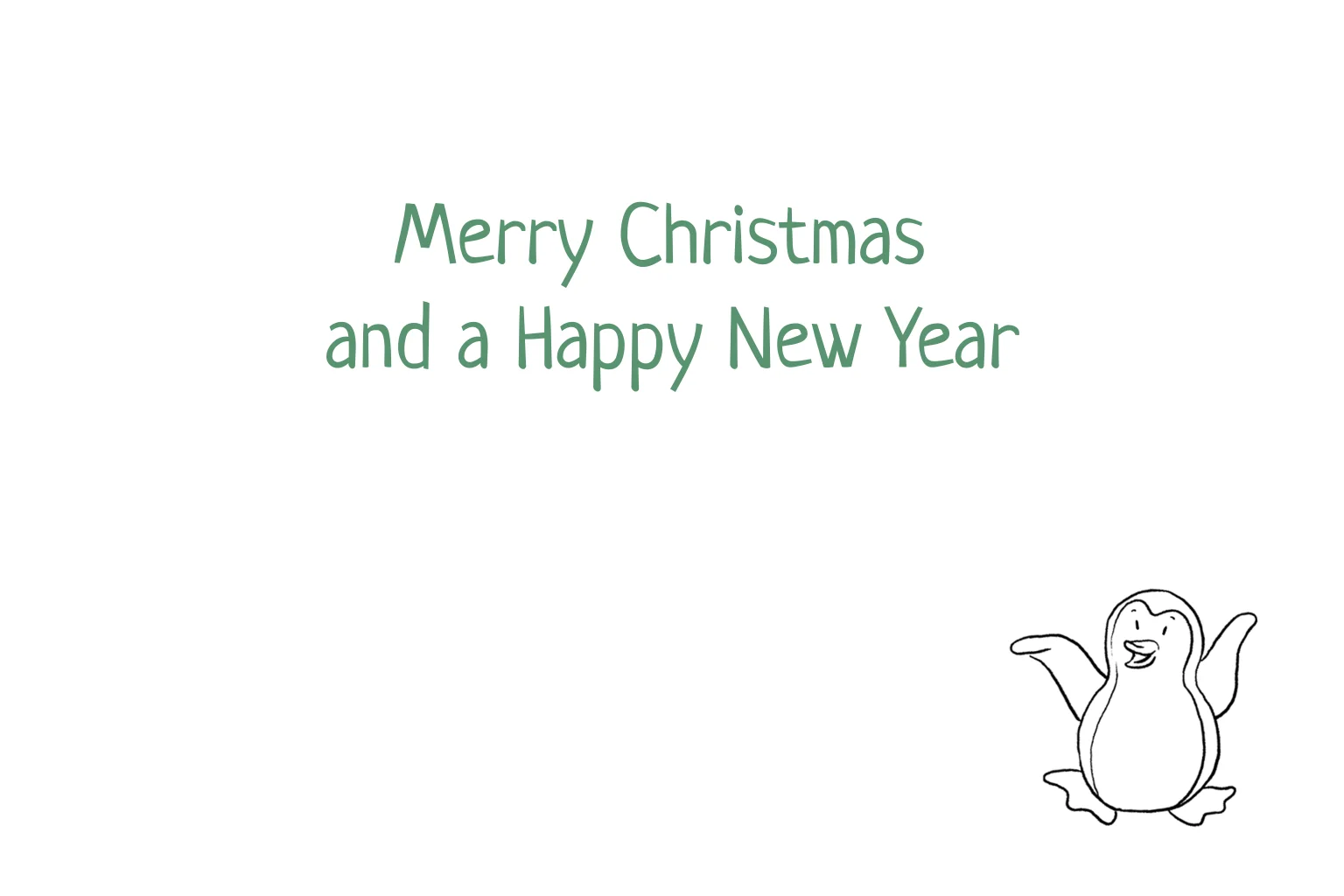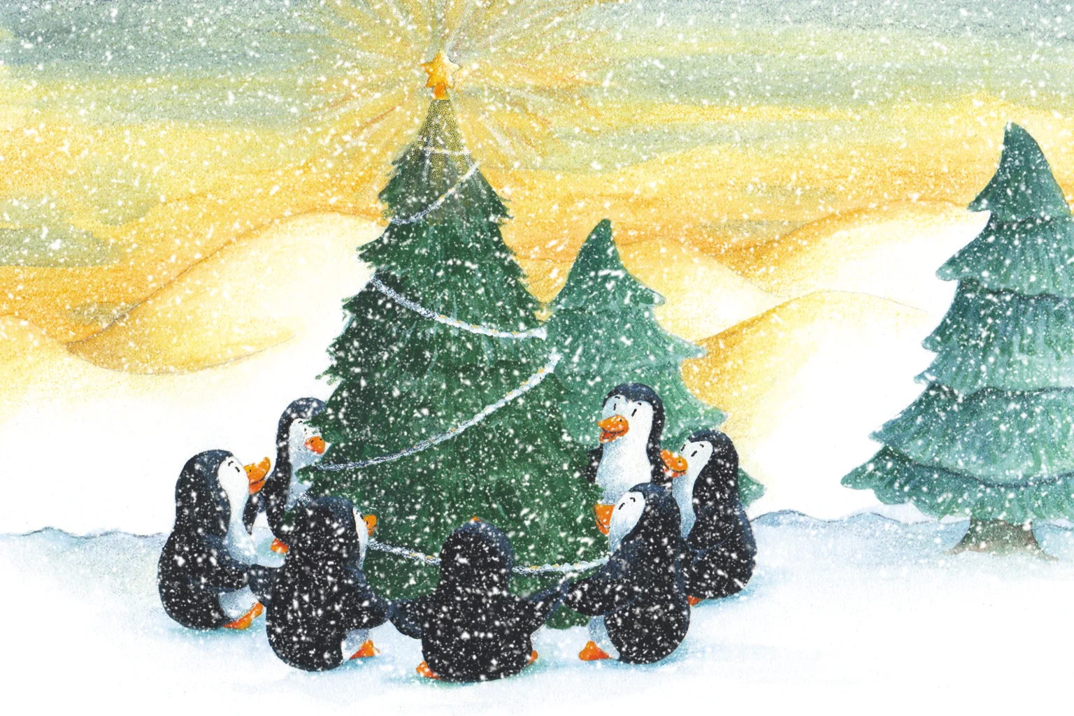 Vrolijke kerstkaart met illustratie van allemaal pinguïns in een kring om een kerstboom in de sneeuw. (24305)