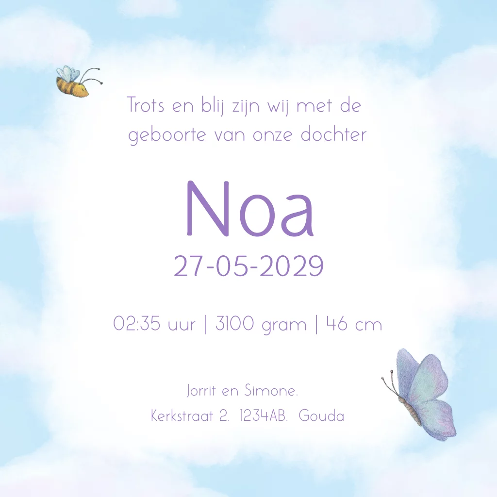 Schaap geboortekaartje voor een meisje of jongen met een schaapje, vlindertje en wolkjes. (23752)