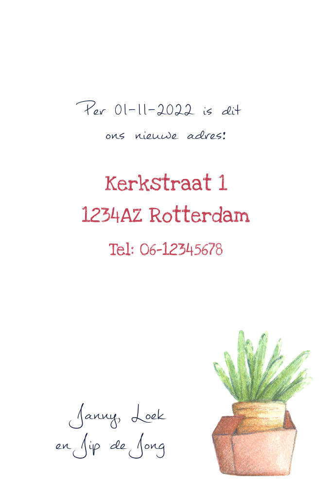 Verhuiskaart met illustratie van olifant met alle verhuisspullen op zijn rug en een vogeltje dat de weg wijst. (23429)