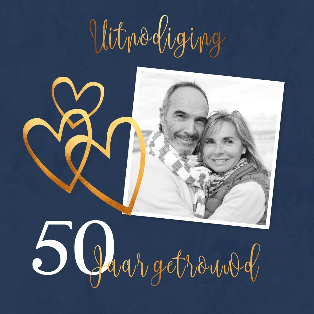 Foto uitnodiging voor jullie 50-jarige huwelijk. Deze kaart kun je zelf bewerken, ook de kleur is aan te passen. Plaats een mooie foto op deze kaart met een donker blauwe velvet achtergrond en goud kleurige teksten en hartjes. (30288)