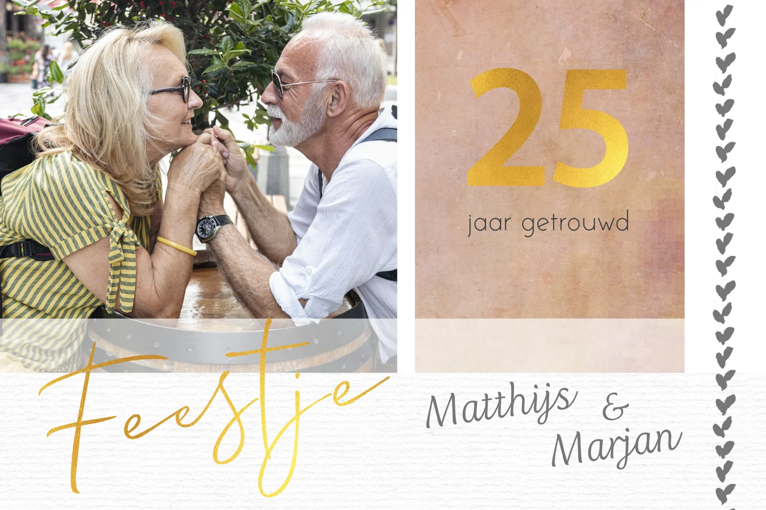Een leuke uitnodiging voor een 25 jarig huwelijks jubileum. Plaats jullie eigen foto op deze uitnodiging met goudkleurige tekst en structuur balkjes en pas de teksten aan. (30375)