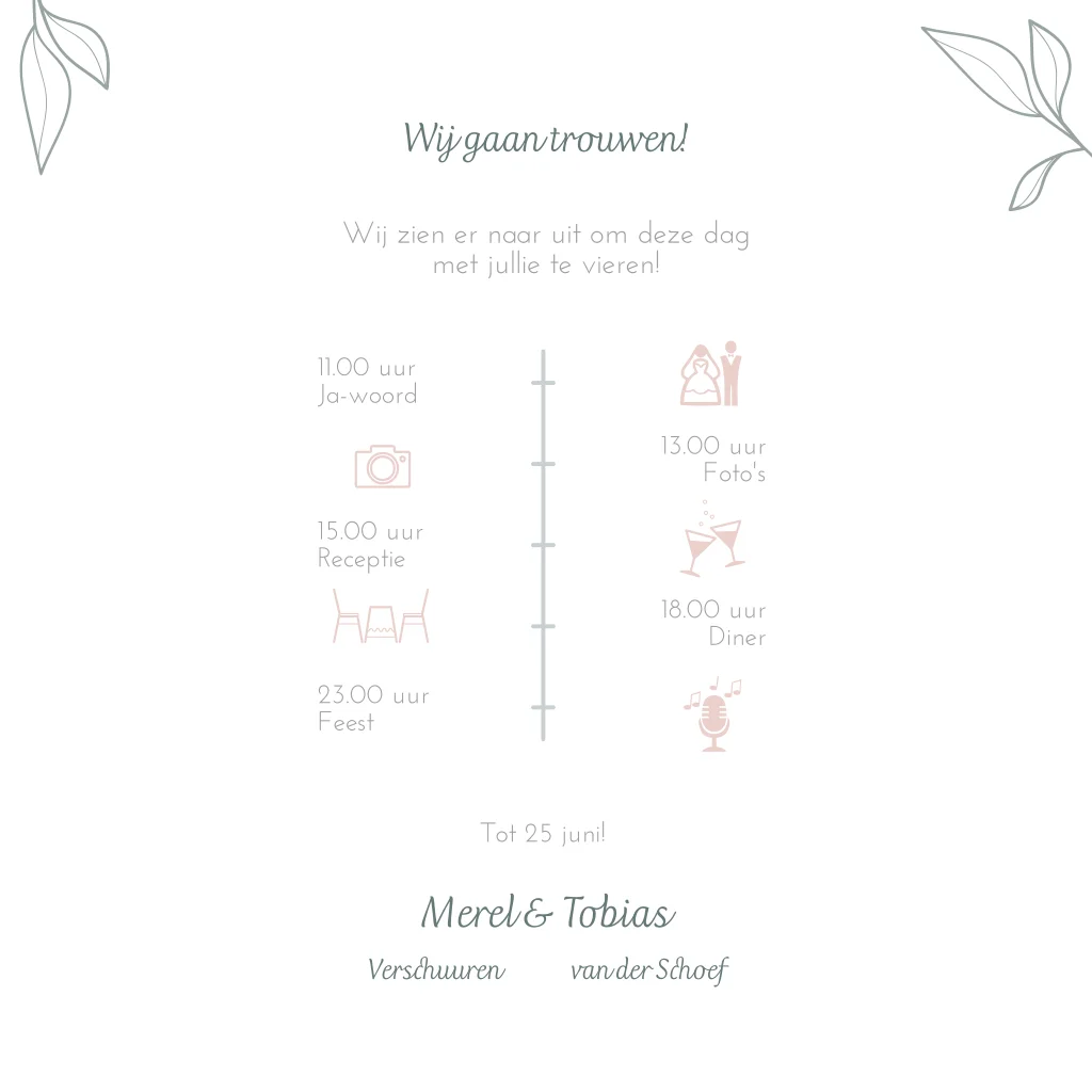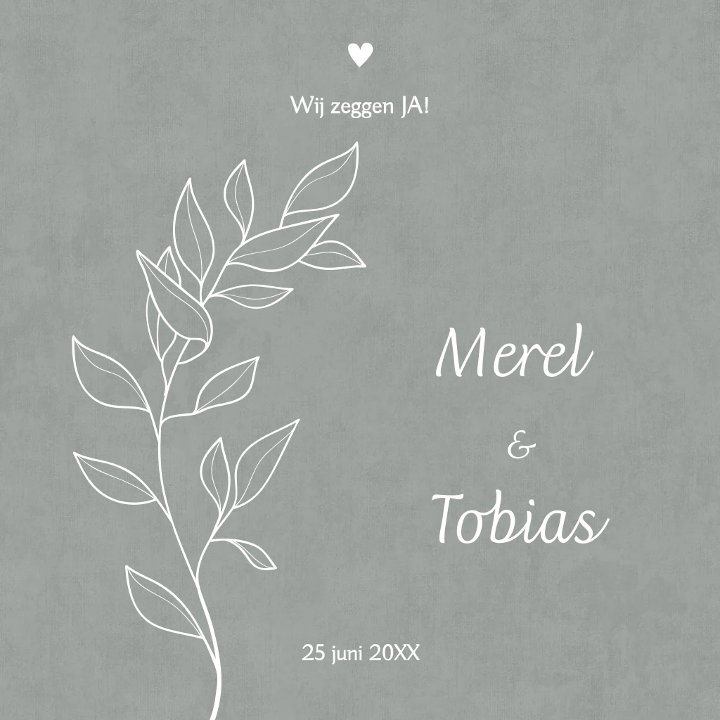 Op deze super mooie trouwuitnodiging voor jullie trouwen staat een takje in outlines, gedrukt met roséfolie wat een luxe uitstraling geeft. Deze trouwkaart met een velvet-look achtergrond kun je eenvoudig zelf personaliseren door de teksten, het lettertype en de foliekleur aan te passen. (30312)